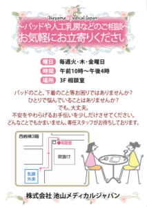 人工乳房のサンプルを実際に手に取ってご覧いただけるほか、乳房パッドの試着も可能です。下着に関するご相談も、どうぞお気軽にお声がけください。